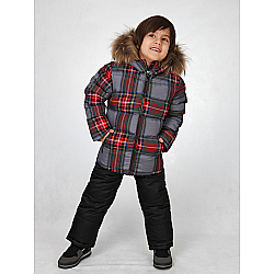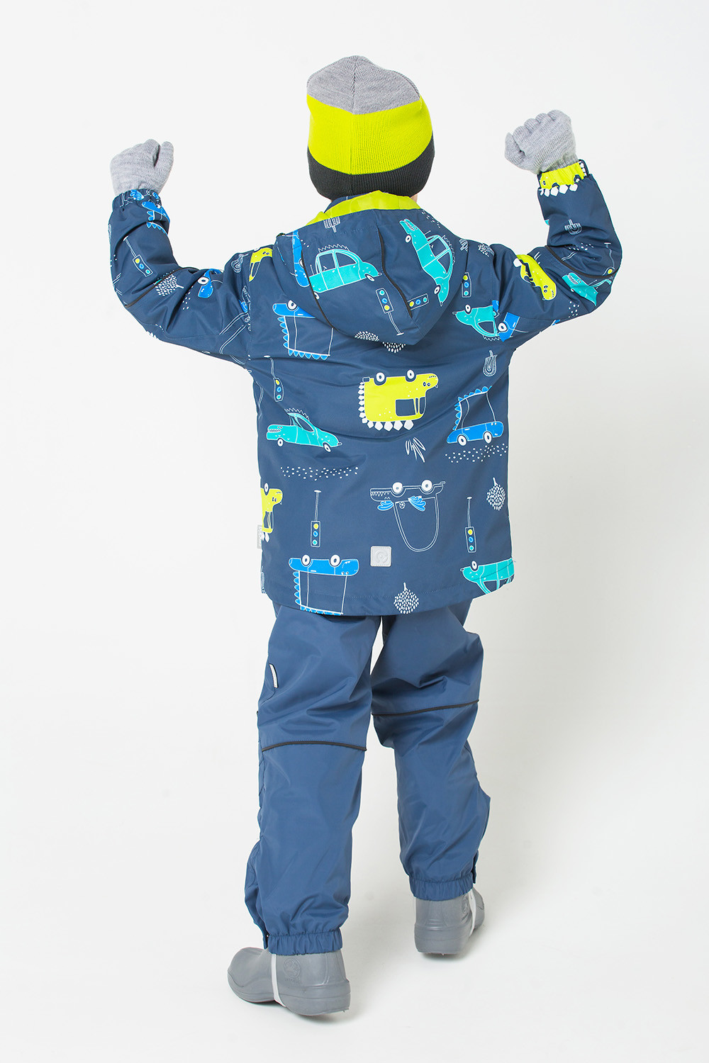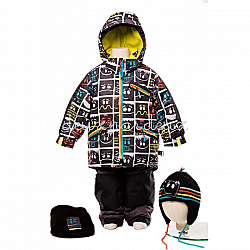 Ветровка и полукомбинезон выполнены из мембранной ткани с тефлоновым покрытием, обладающим грязе- и водоотталкивающими свойствами. Несъёмный капюшон, утяжка со стопперами на капюшоне и по низу куртки. Молния с внутренней ветрозащитной планкой, для пристегивания флисового жакета предусмотрены кнопки на внутренней стороне спинки и по низу рукавов. Полукомбинезон c регулируемыми эластичными подтяжками. Пояс на эластичной резинке. По низу штанин силиконовые штрипки и застежки на кнопки. Светоотражающие элементы.