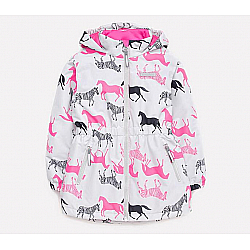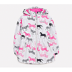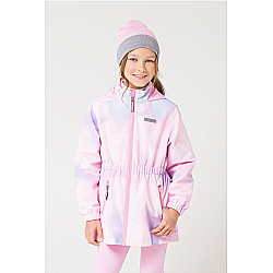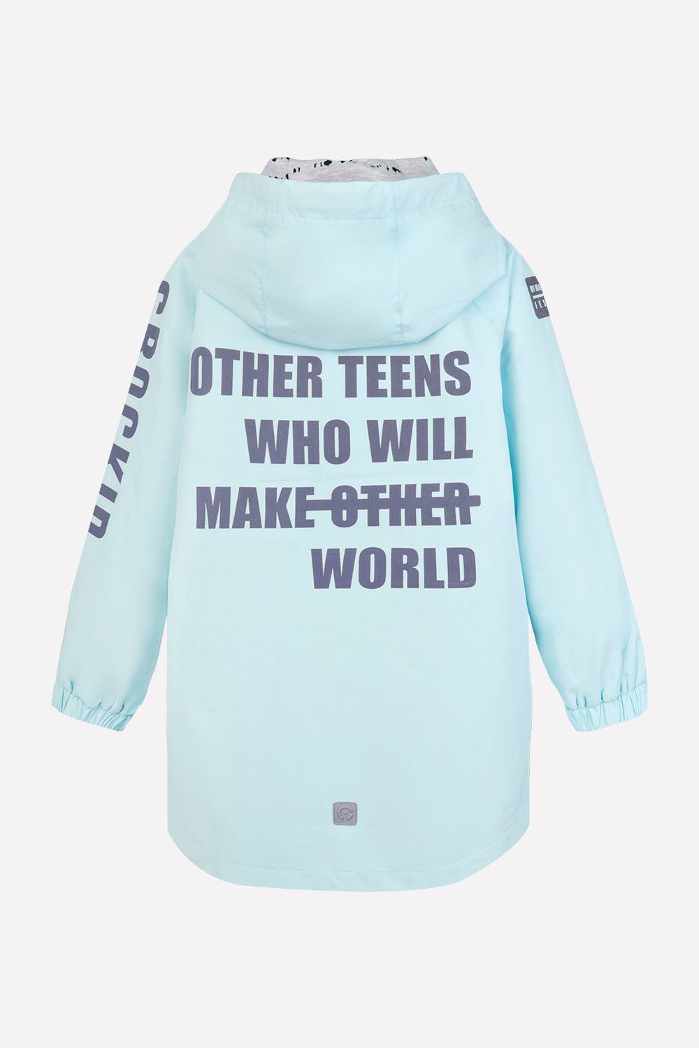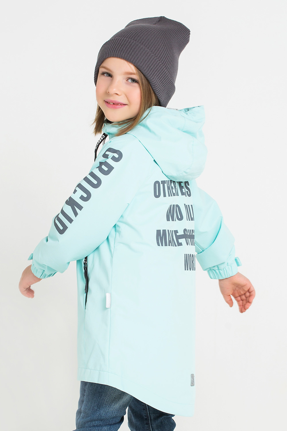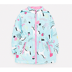 Плащ для девочки на подкладке. Мембранная ткань обладает водоотталкивающими свойствами. Несъёмный капюшон, по краю капюшона кулиса со шнуром. Вешалка-петелька на внутренней стороне спинки. Застежка на молнию с клапаном, защищающим подбородок. Боковые карманы на молнии. Рукава реглан, манжеты с эластичными резинками и патами на липучках. Закругленная спинка оформлена длиннее полочки. На рукавах и спинке светоотражающий принт.